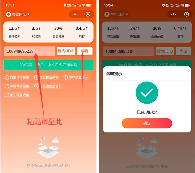 这样就可以开始网盘资料转存推广了,每个新绑定账号都可以免费申请20T容量和15天SVIP会员,足够前期的资源填充了。
