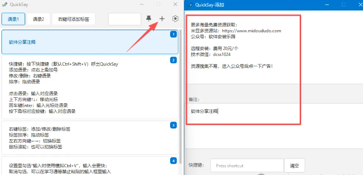 上周给新手同事打包软件,我第8次打开记事本复制安装说明时差点崩溃——就为那几行字,每天得重复点开、选中、复制、粘贴,烦得想砸键盘。这破事要是能一键解决该多好啊! 这工具就是你的“话术外挂”,双击就能把常用语录秒粘到任何地方,彻底告别重复劳动。 适合:天天复制粘贴固定话术的运营、客服、程序员(比如我这种爱分享工具的博主)。 不适合:需要复杂脚本自动化的大佬——这玩意儿就为“懒人”设计,越简单越香。 来,咱们5分钟搞定它!先去下个压缩包(别慌,就1MB多),解压后直接双击【QuickSay】运行——对,连安装都不用! 第一次打开界面贼干净,右上角那个“+”号点一下,弹出的框里填上你要存的话术(比如“解压密码是123”),再随手写个备注“软件包说明”,搞定!这时候你会看到左边列表里多了条记录,备注清清楚楚,比翻记事本强100倍。 用的时候更绝:需要粘贴时,直接双击列表里的语录,它自动存进剪贴板,你“Ctrl+V”就能用。要是嫌双击麻烦,右键点软件设置里开个全局快捷键(比如我设的Alt+Q),以后按组合键直接呼出工具,选中就粘,丝滑得像德芙。 哦对了,语录太多?右键新建个“工作”分组,把客户话术和内部说明分开装,再乱也找得到。 场景一:客服救急。把“稍等正在查询”“请提供截图”存进去,客户催单时3秒回话不心累。 场景二:技术支援。像我打包软件时,把“解压密码”“运行环境要求”存成语录,再也不用满屏找记事本。本文工具:QuickSay;适用平台:Windows。